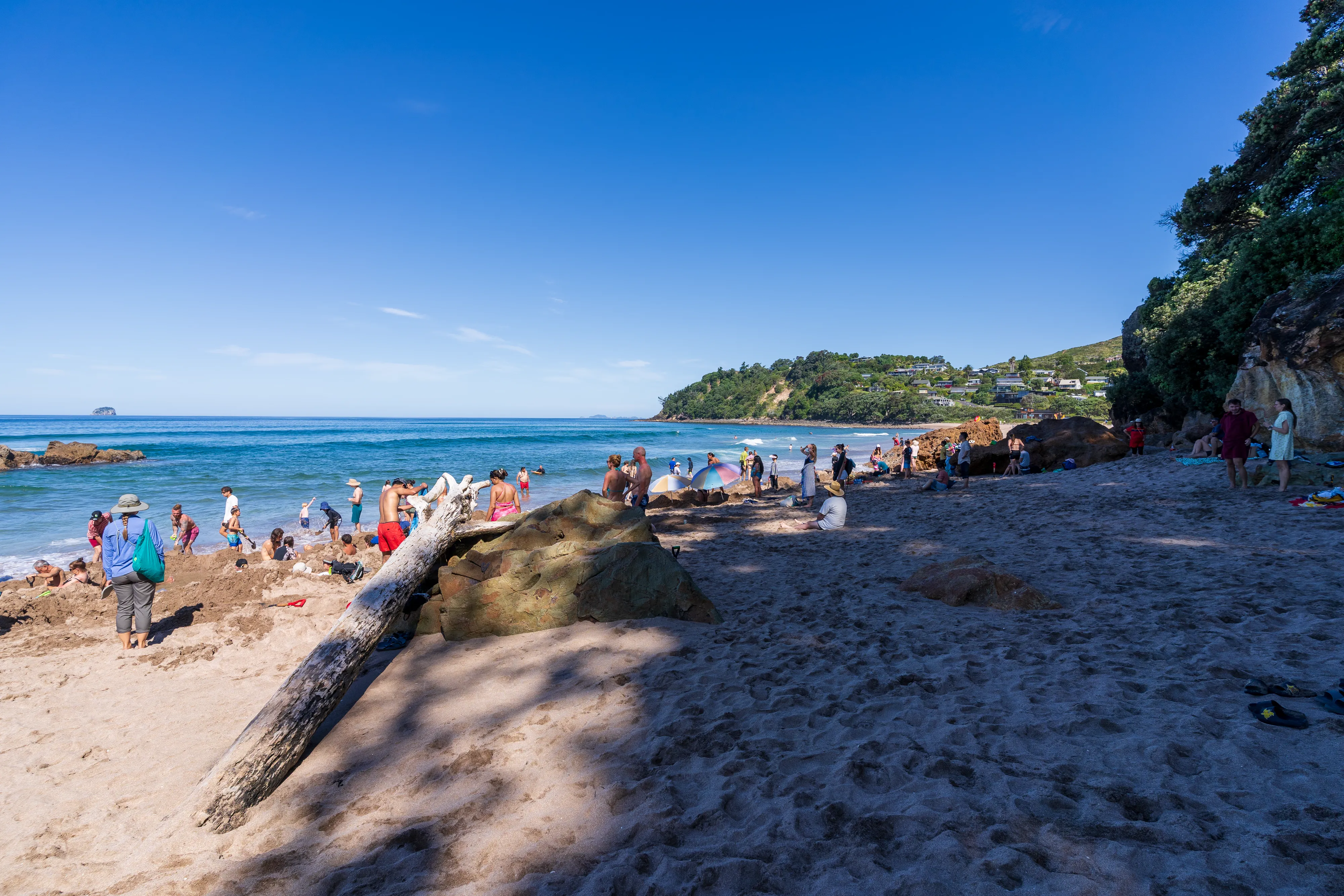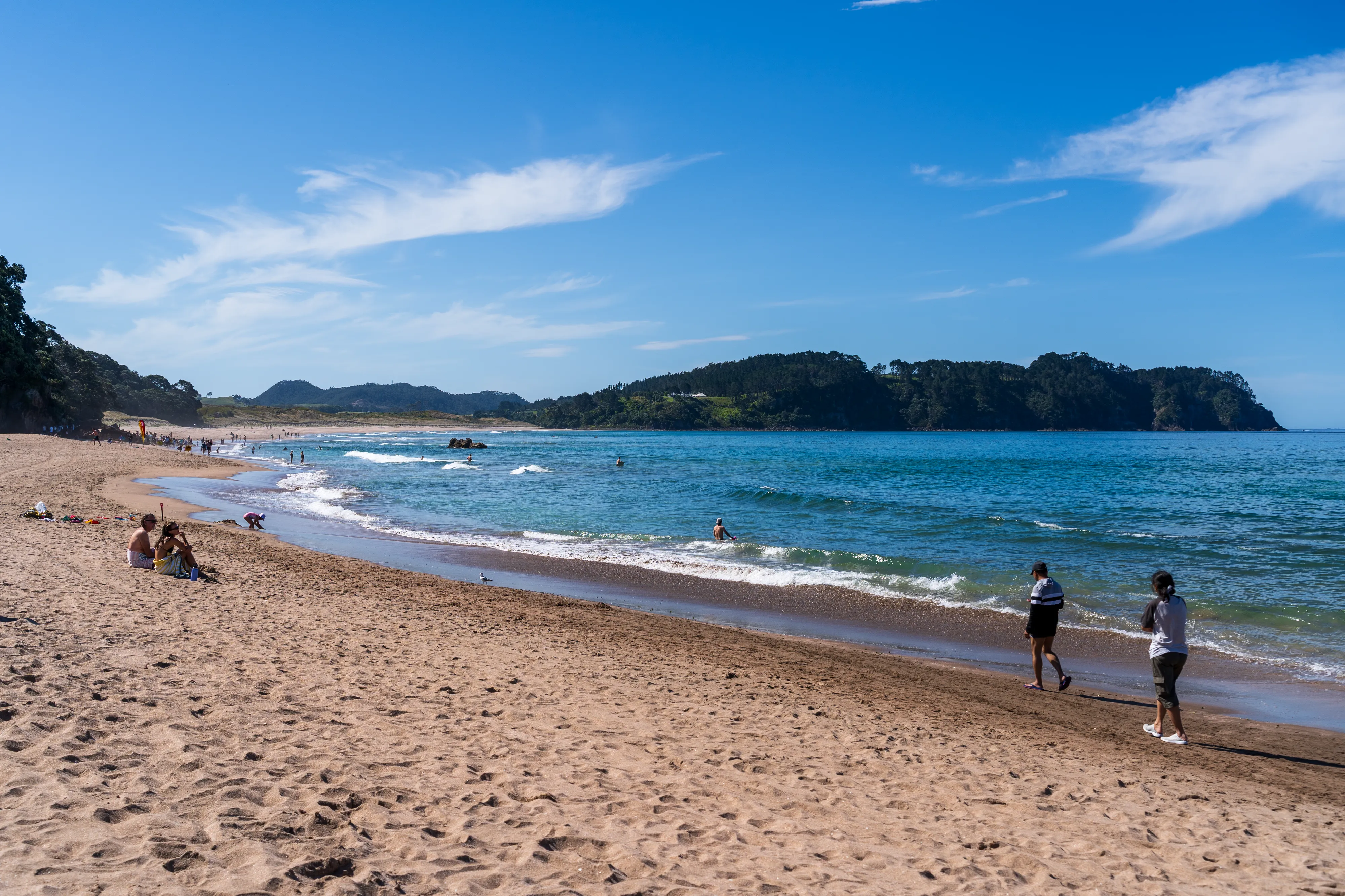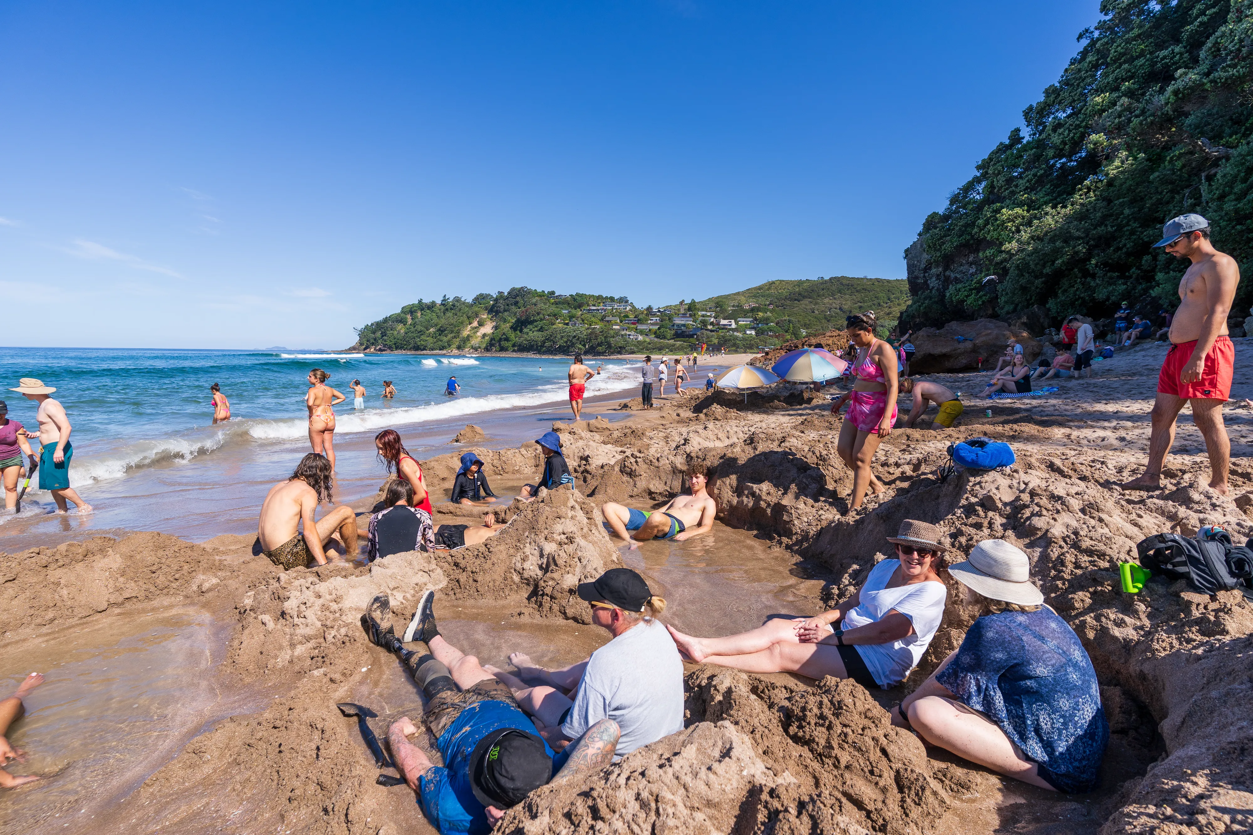 Wir überqueren die auf der Halbinsel aufragenden Berge und fahren an die Ostküste und dann Richtung Süden bis zum Hot Water Beach: Dort kann man sich bei Ebbe Löcher am Strand buddeln und mit etwas Glück trifft man dabei auf eine Stelle, an der heißes Wasser an die Oberfläche gelangt.