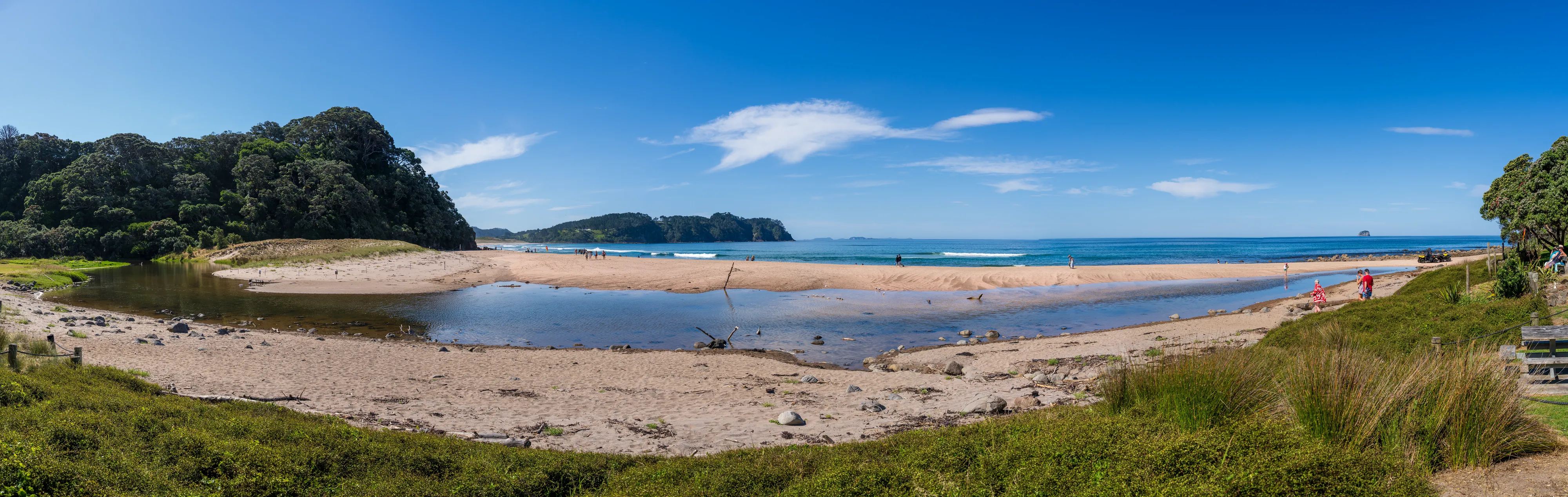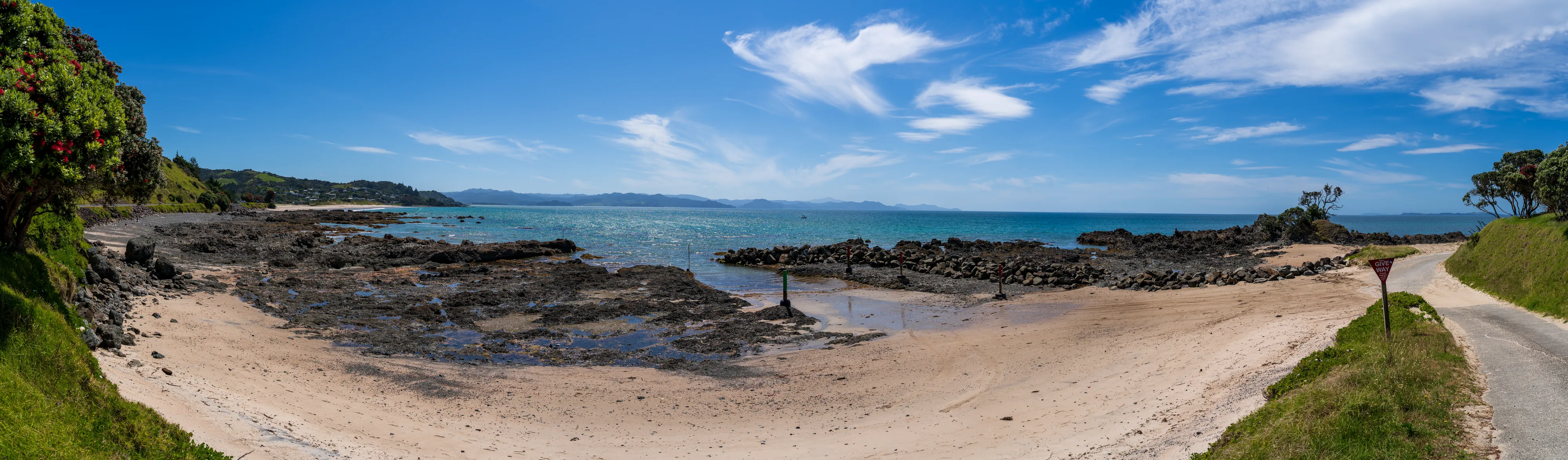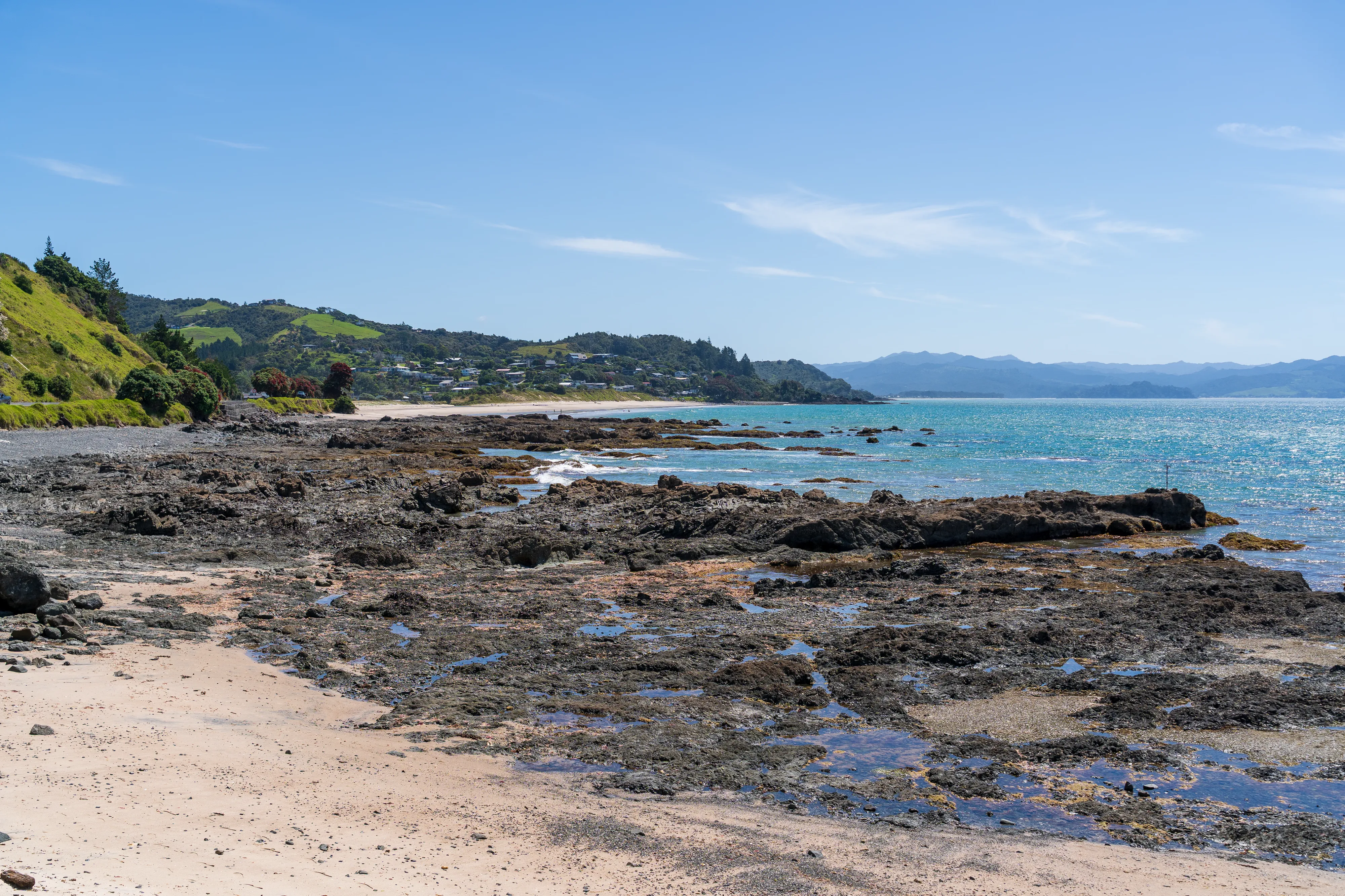 Wir überqueren die auf der Halbinsel aufragenden Berge und fahren an die Ostküste und dann Richtung Süden bis zum Hot Water Beach: Dort kann man sich bei Ebbe Löcher am Strand buddeln und mit etwas Glück trifft man dabei auf eine Stelle, an der heißes Wasser an die Oberfläche gelangt.
