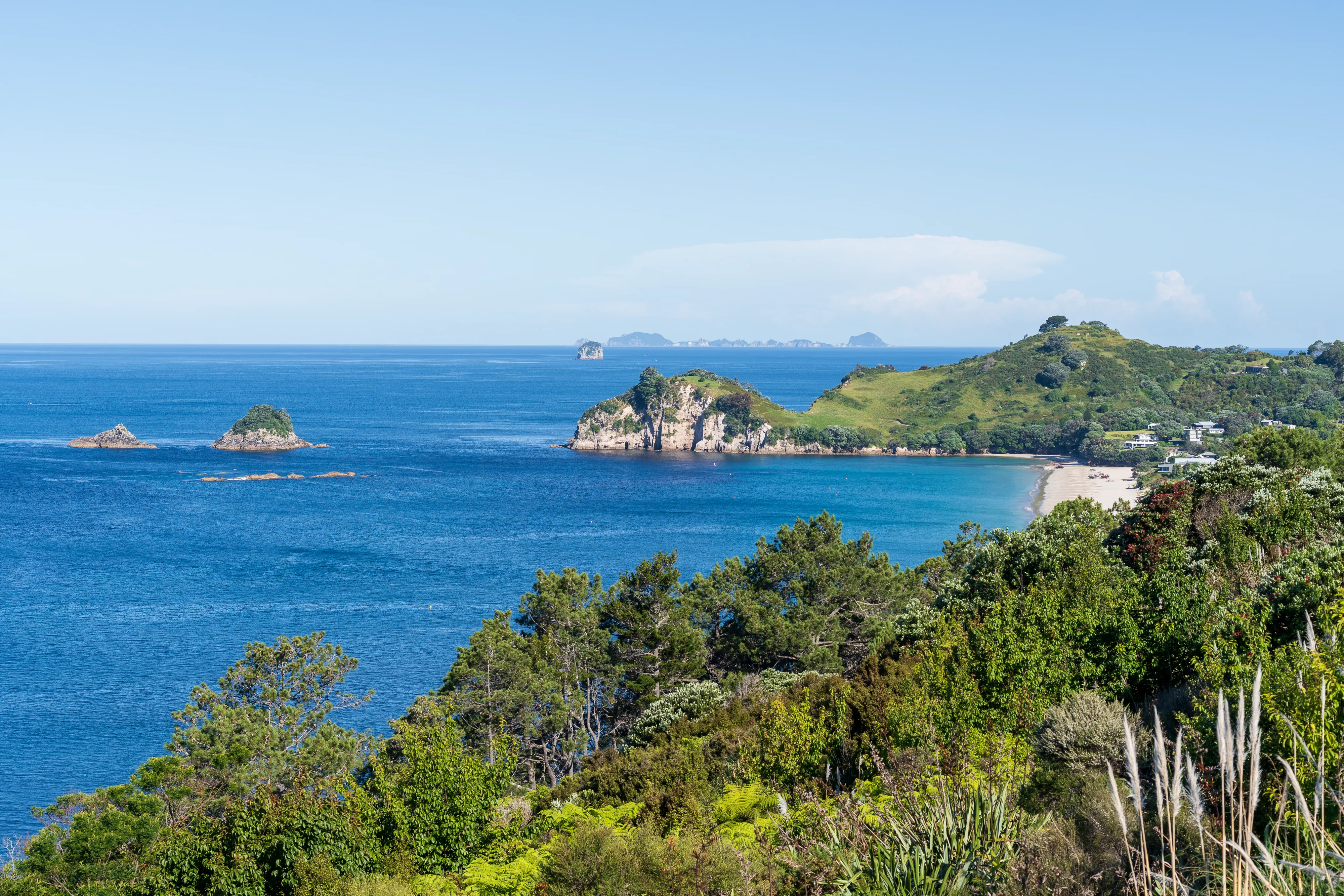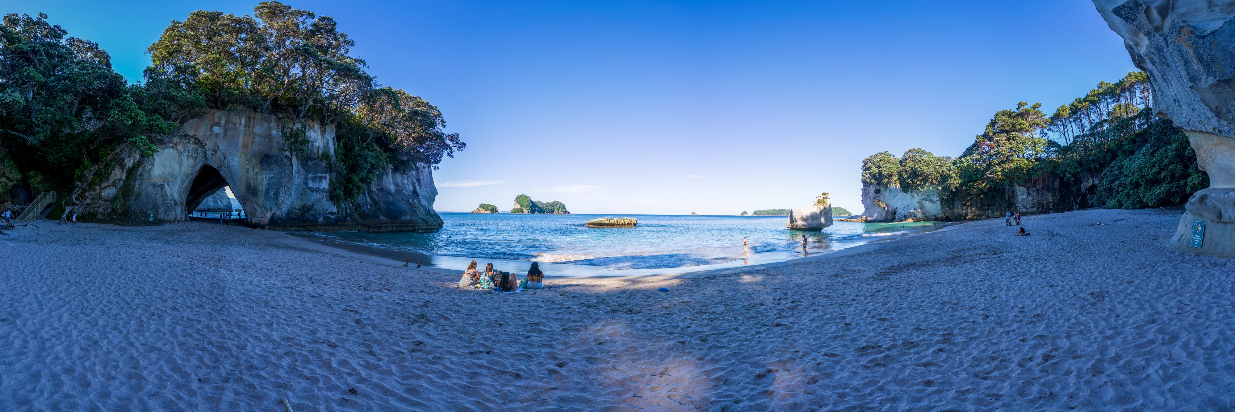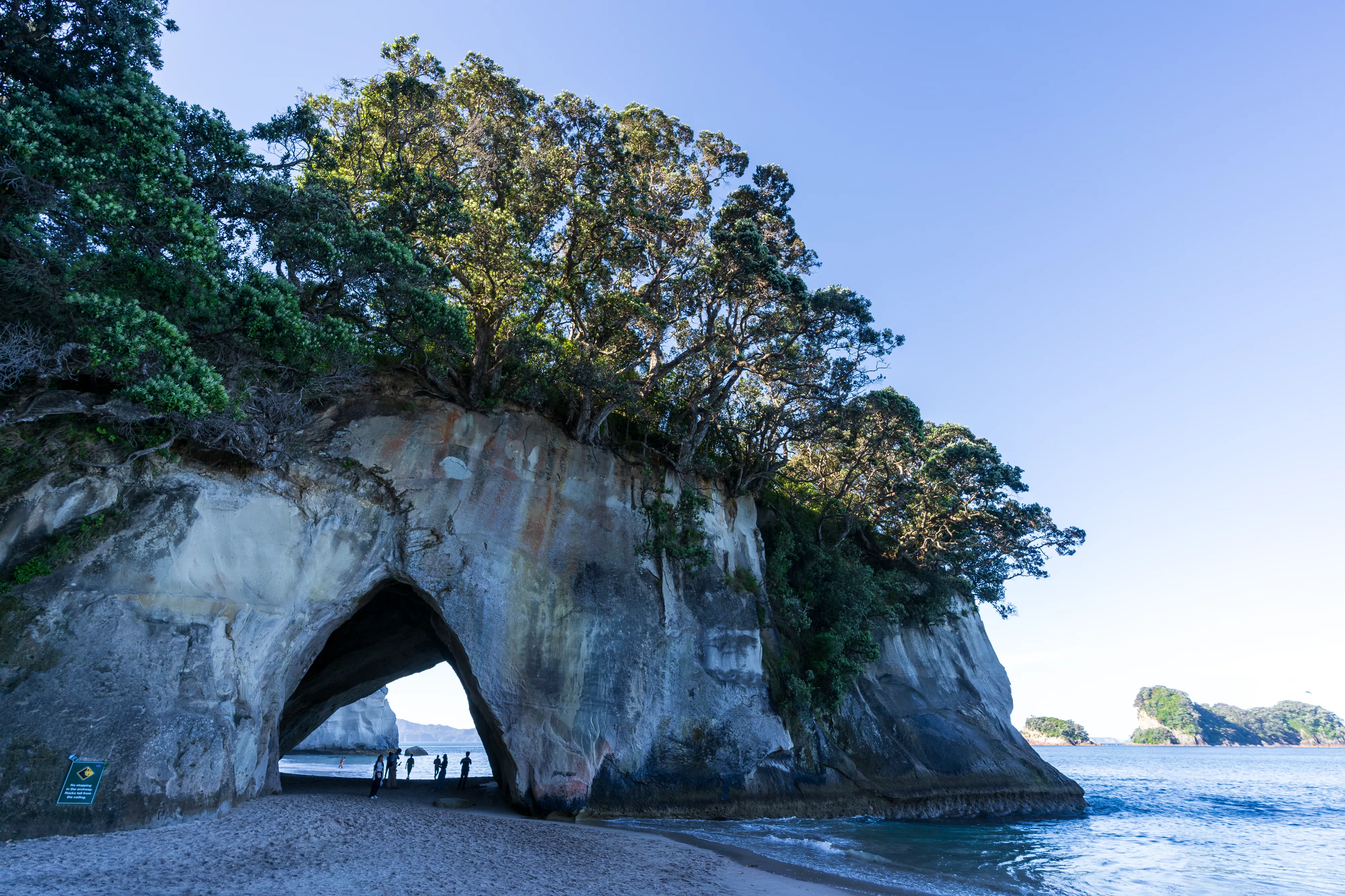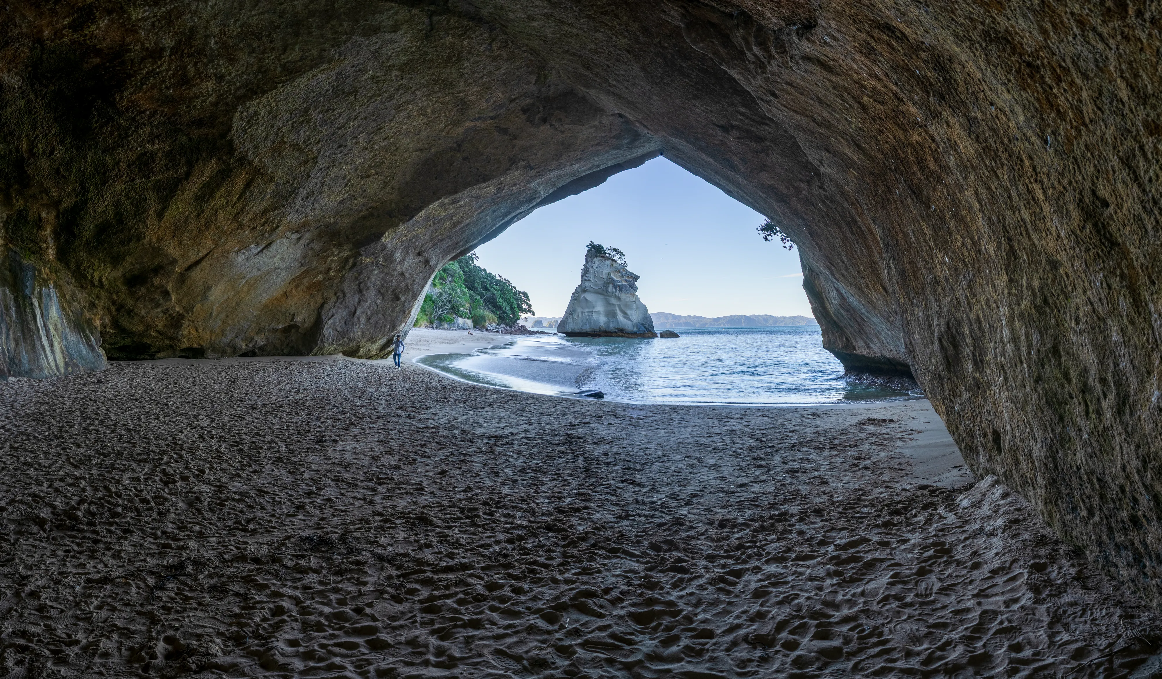 Von hier aus geht es nach Hahei und dort zur Cathedral Cove. Die Cathedral Cove erreicht man über einen Küstenwanderweg und entpuppt sich als kleine, von Felsen umgebene Bucht mit einer großen Felsöffnung, durch die man bei Ebbe trockenen Fußes zur nächsten Bucht gelangt. Etwas oberhalb findet sich auch noch ein schöner Aussichtspunkt auf die Küste.