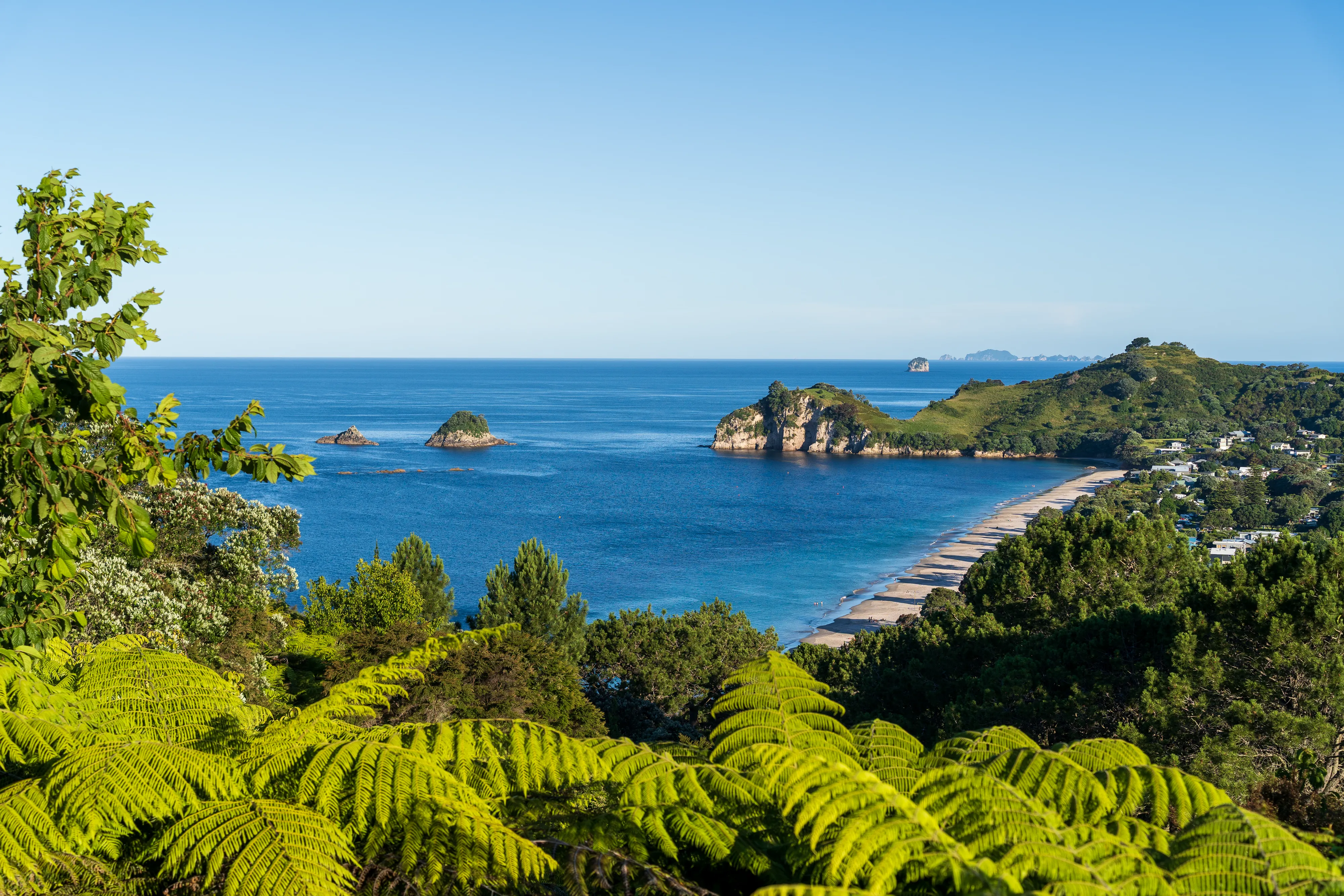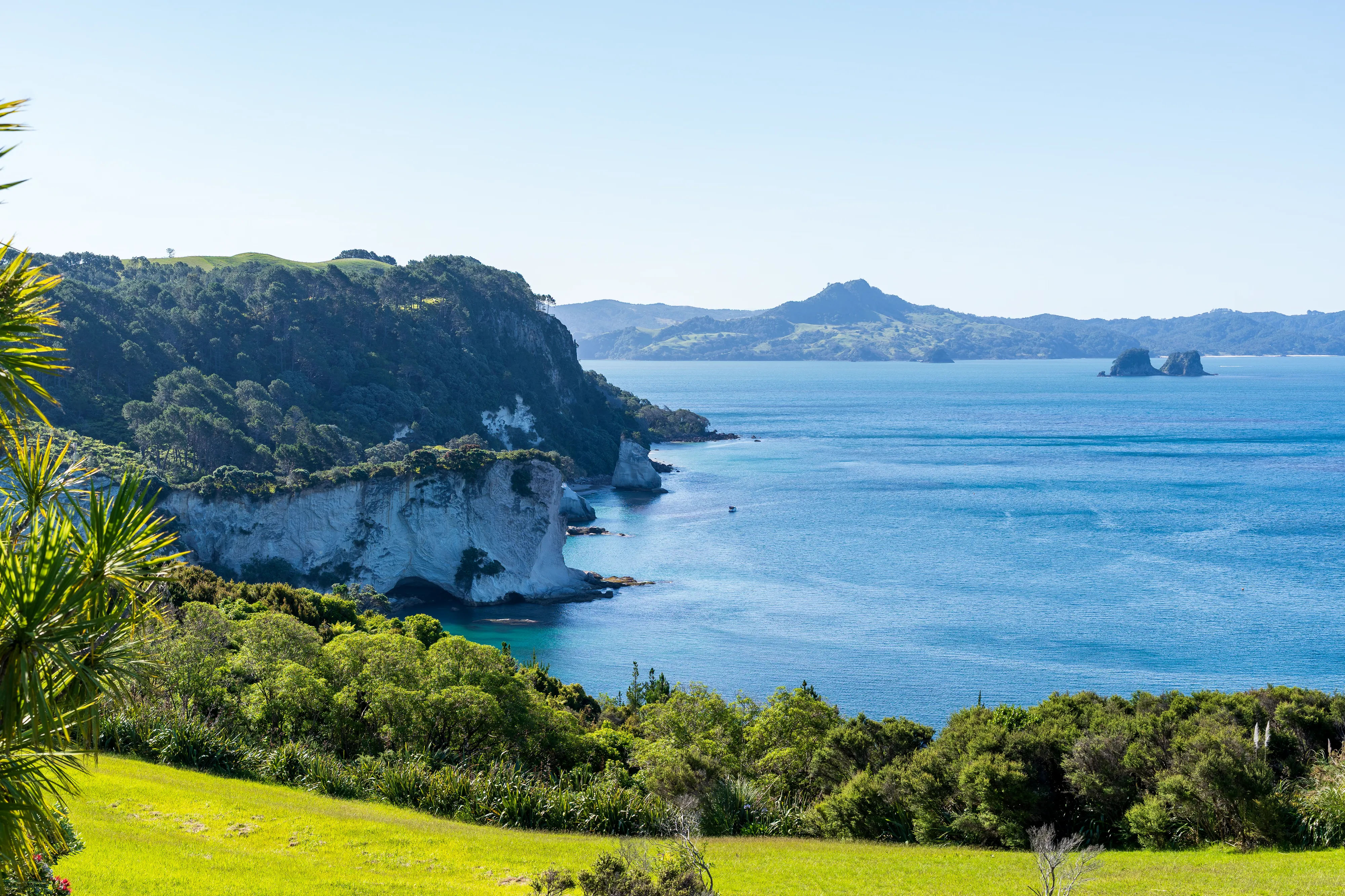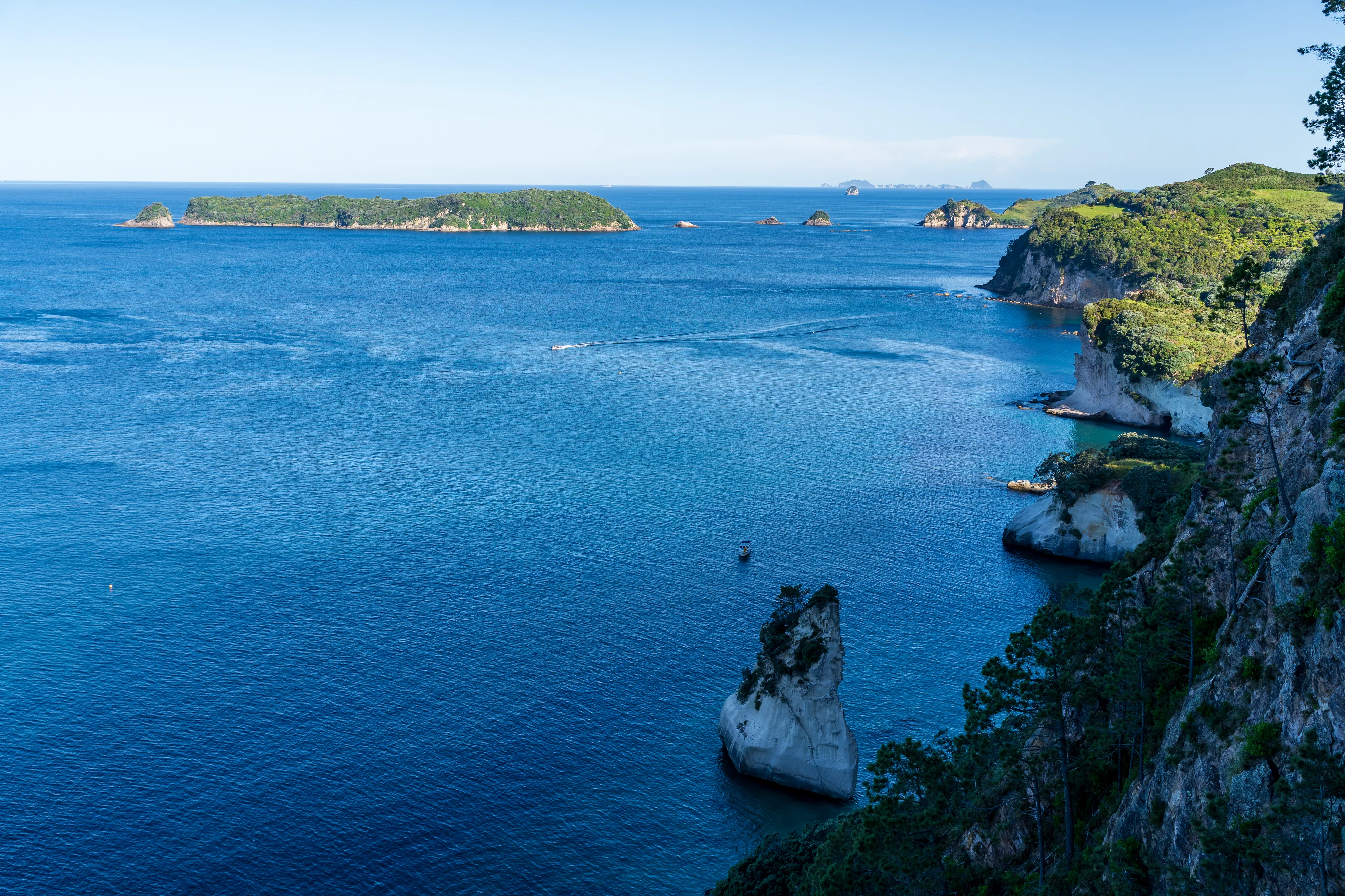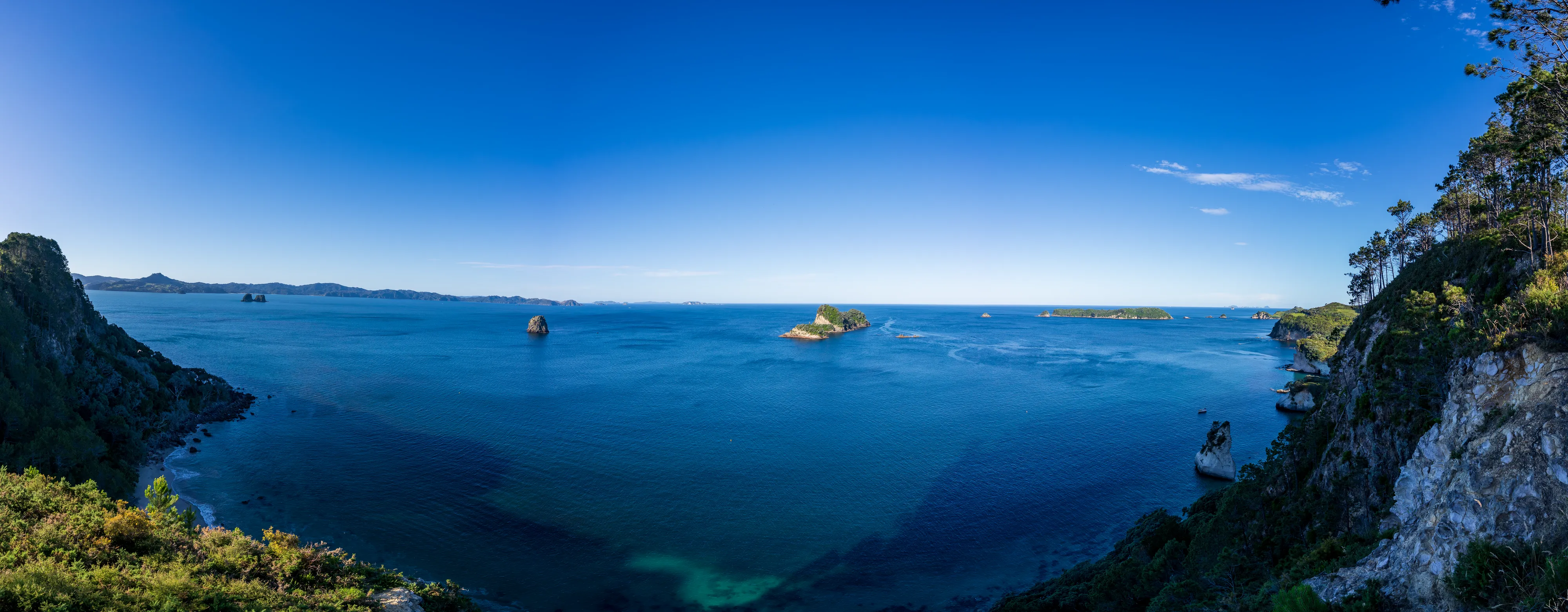 Von hier aus geht es nach Hahei und dort zur Cathedral Cove. Die Cathedral Cove erreicht man über einen Küstenwanderweg und entpuppt sich als kleine, von Felsen umgebene Bucht mit einer großen Felsöffnung, durch die man bei Ebbe trockenen Fußes zur nächsten Bucht gelangt. Etwas oberhalb findet sich auch noch ein schöner Aussichtspunkt auf die Küste.