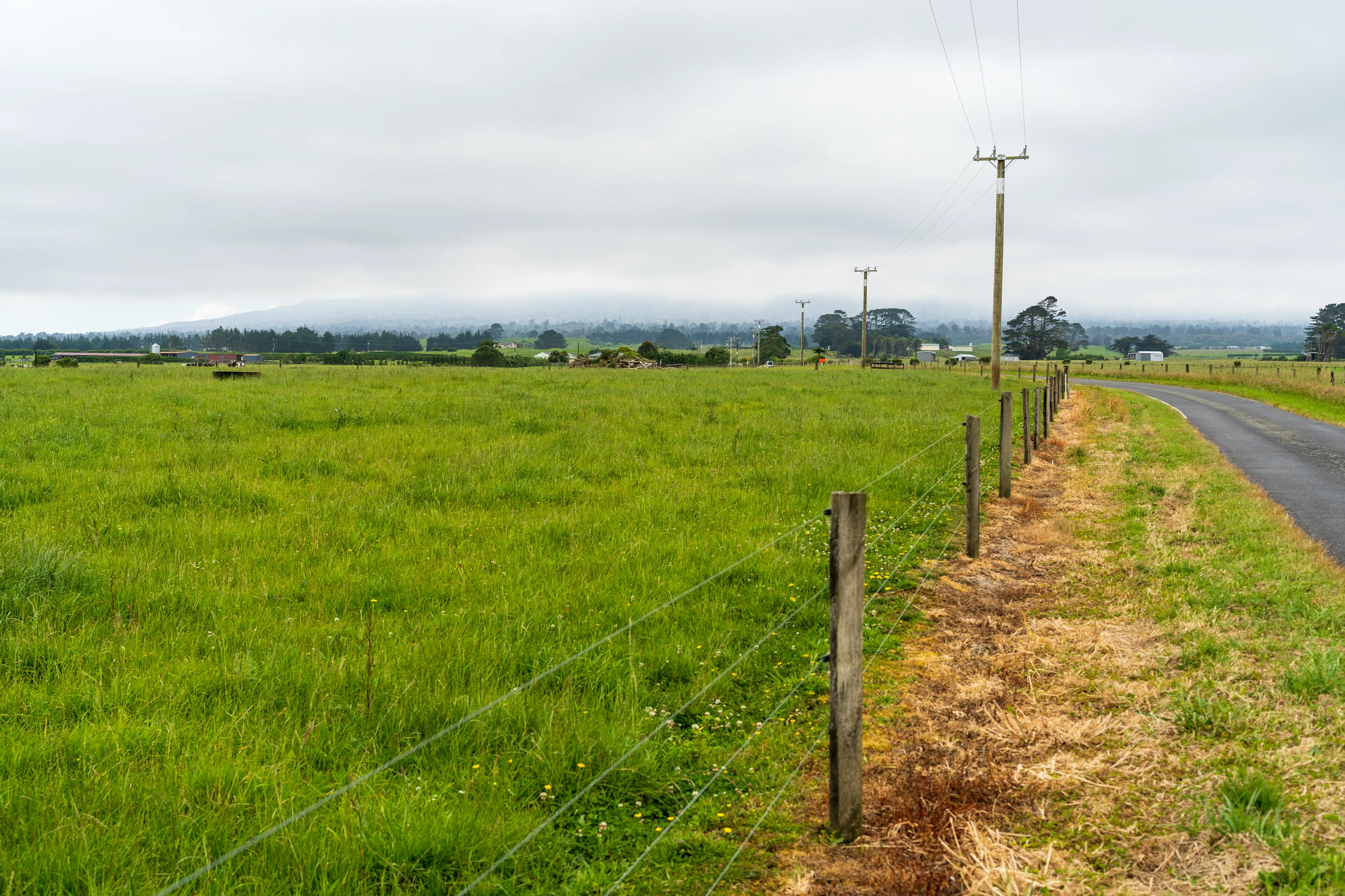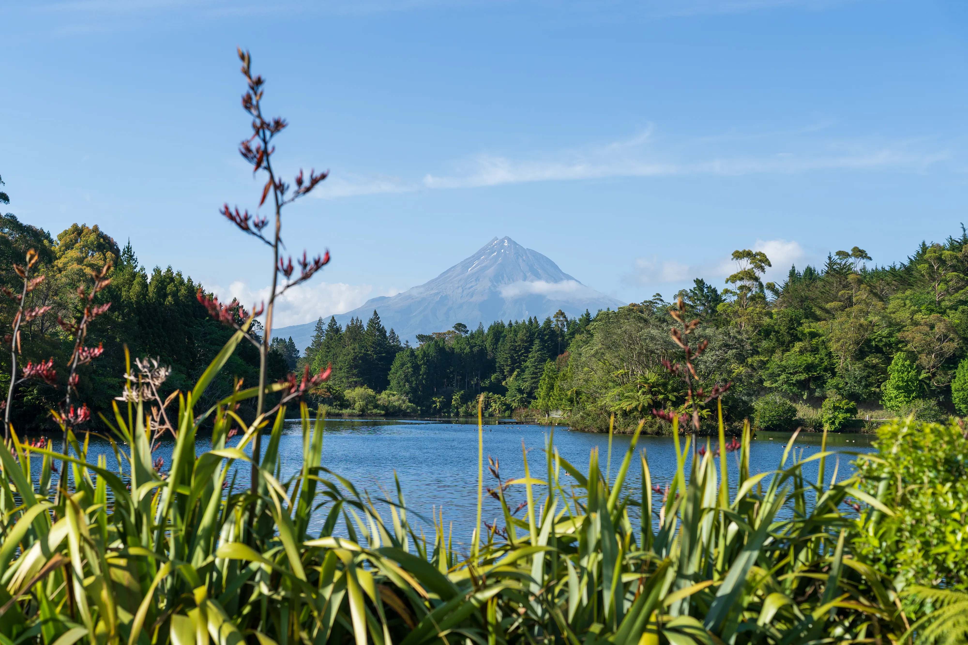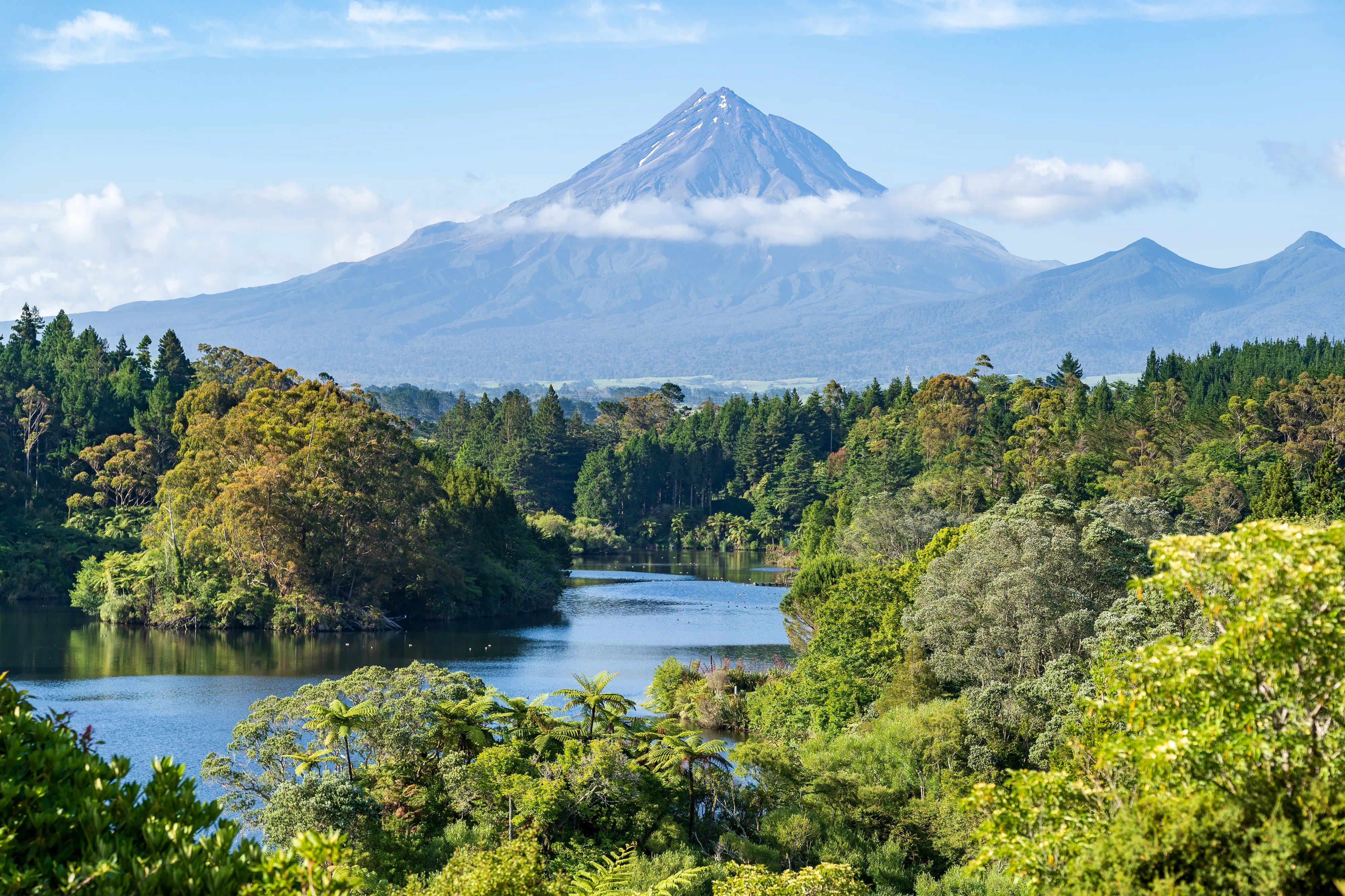 Am Ende des State Highway 43 erreichen wir die Gegend um den Mt Taranaki, den ikonischen, spitzkegelförmigen Stratovulkan, der der ganzen Region seinen Namen gegeben hat. Leider ist der Gipfel jedoch in den mittlerweile aufgezogenen Wolken nicht zu sehen. Mit einer Höhe von 2518 m ist dieser prinzipiell sehr markant, da es keine anderen Berge in der Umgebung gibt und das Umland zumeist weniger als 200 m über dem Meeresspiegel liegt. Womöglich ist er auch deshalb der meistbestiegene Gipfel Neuseelands.