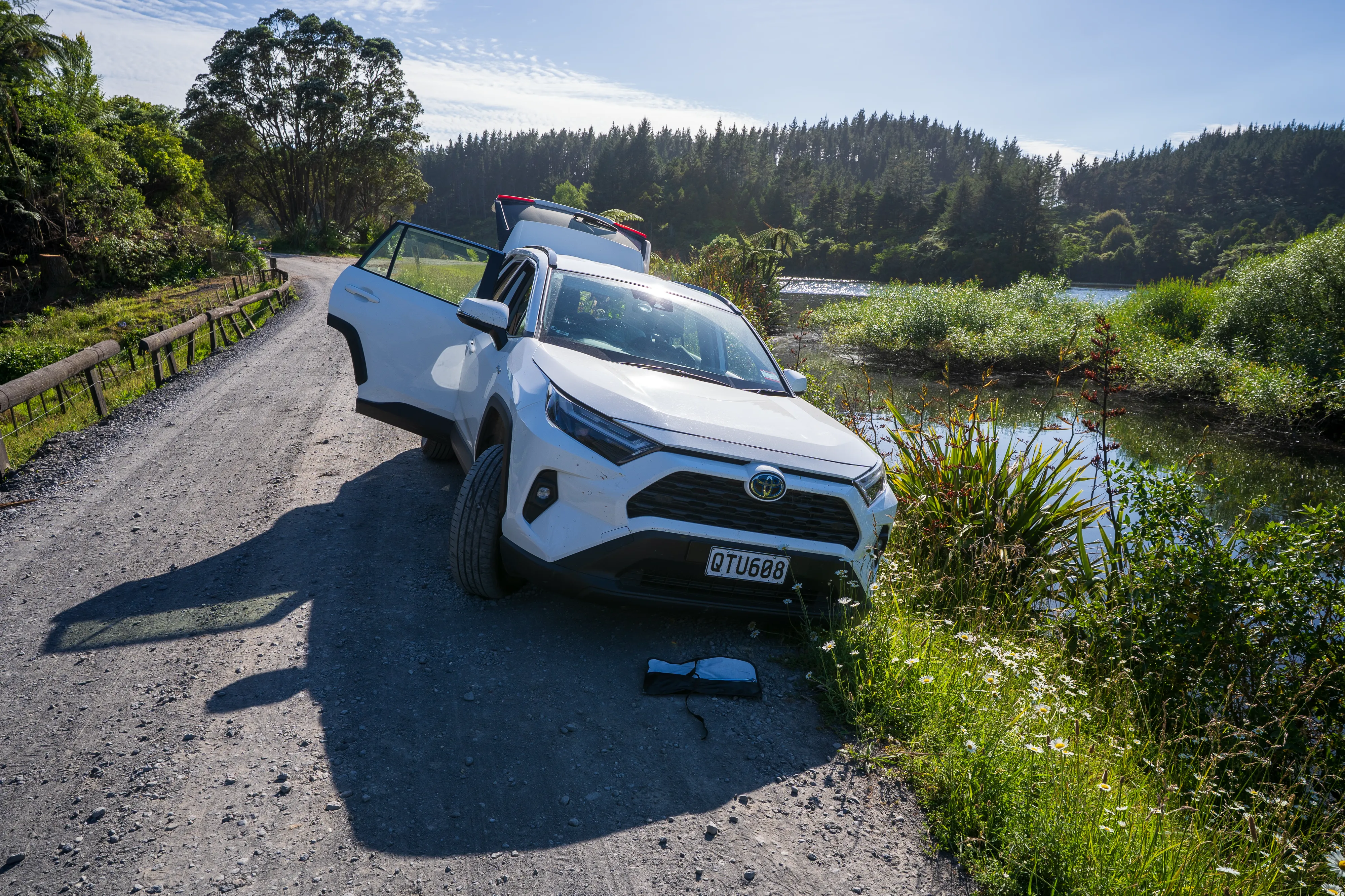 Auf dem Rückweg geschieht dann das Unglück: Wir werden auf einem schmalen Stück Schotterstraße von einem entgegenkommenden Auto abgedrängt und kommen mit der linken Seite des Wagens über die Straßenkante - hinter der es sehr steil die Wiese zum See hinabgeht. Nun stecken wir also in einer leichten Schräglage fest und auch Allrad kann uns nicht aus dieser misslichen Lage befreien, denn wir sitzen ein wenig auf.