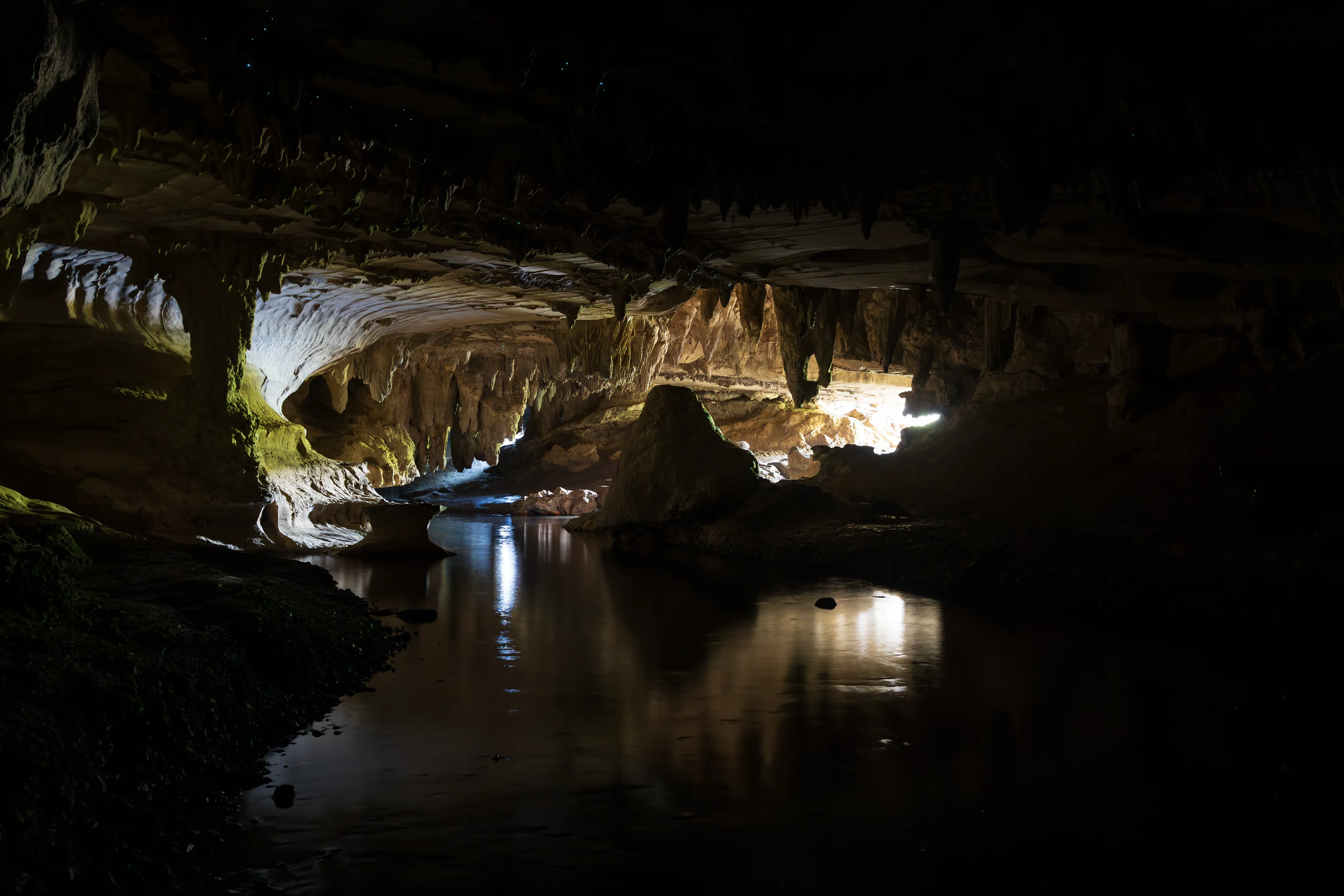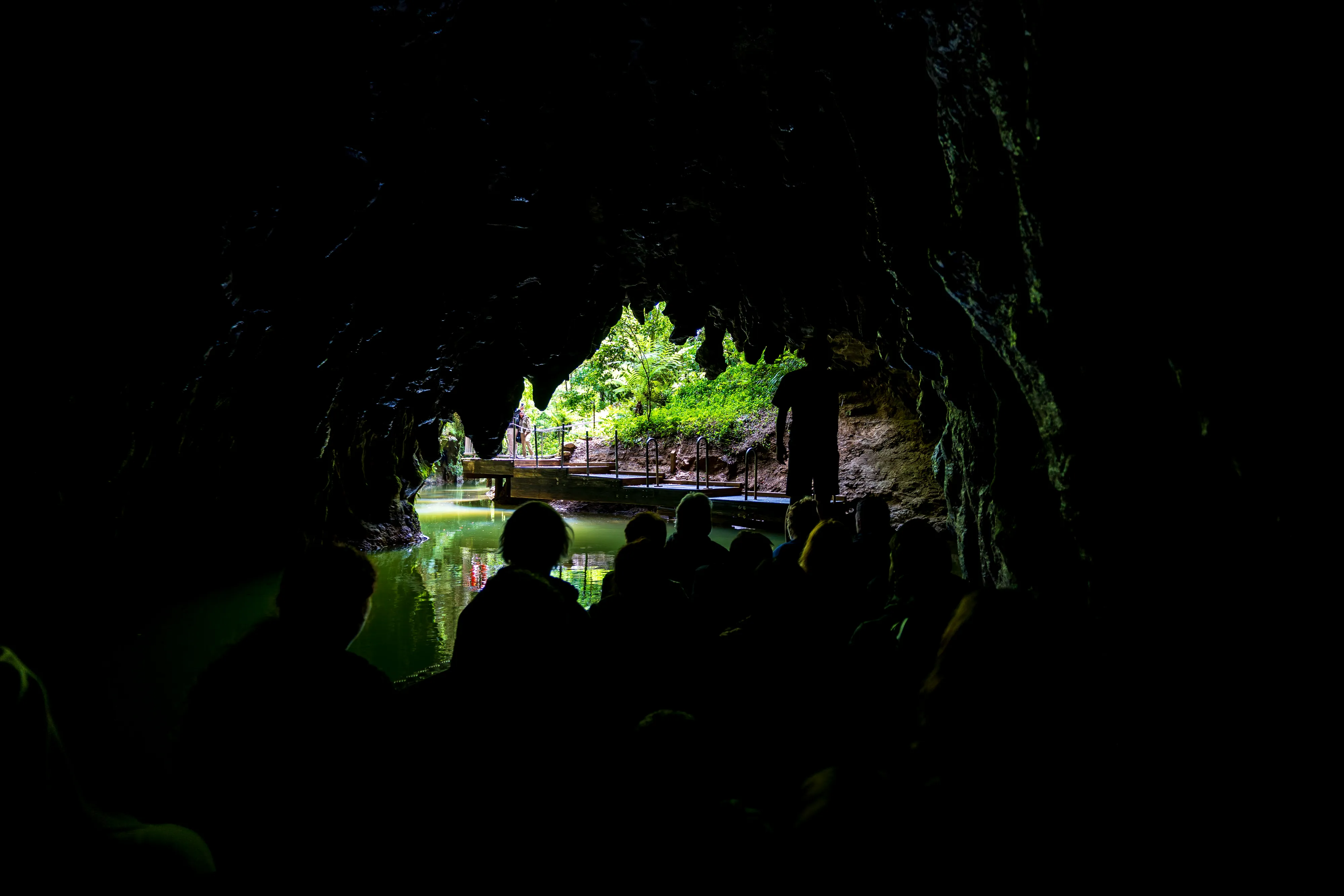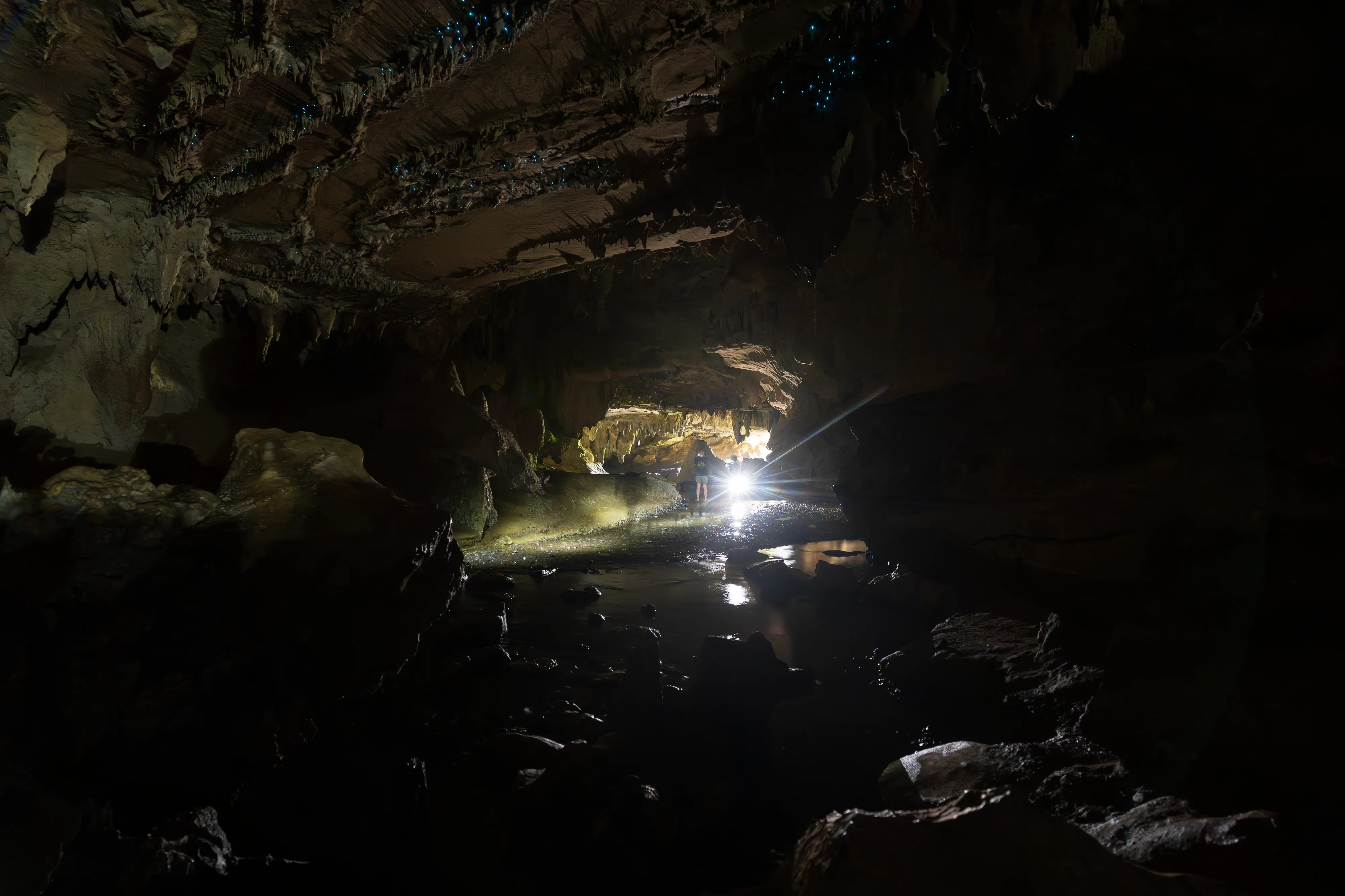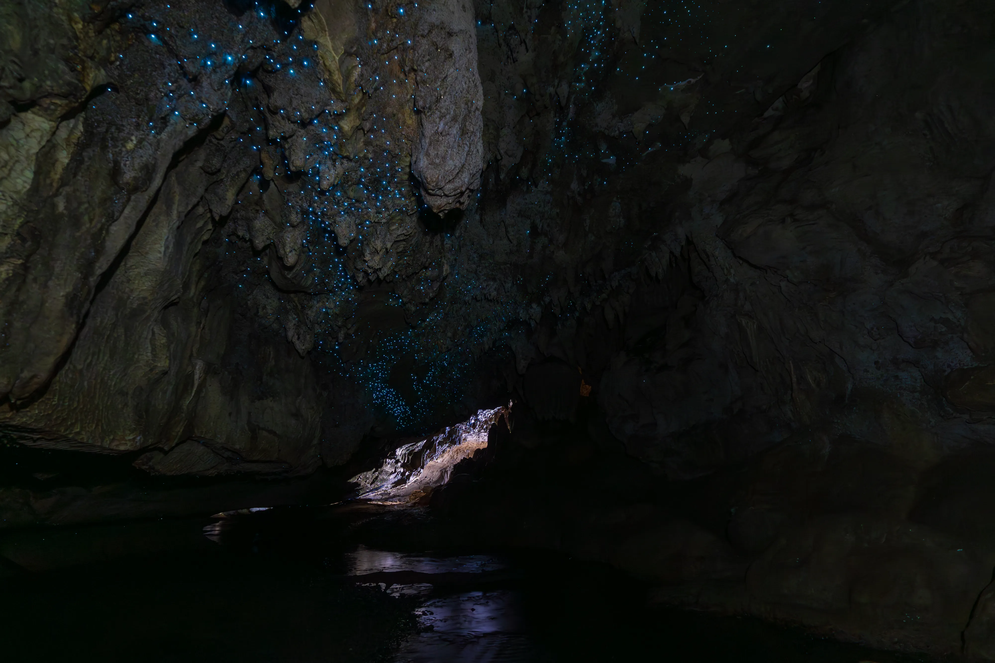 Die Führung beginnt in den Kalksteinhöhlen, bevor es zum eigentlichen Highlight der Tour geht: der Fahrt mit einem Boot über einen unterirdischen Fluss. Die Besonderheit: Über dem Fluss sehen wir unzählige Glühwürmchen an der Decke. Diese Glühwürmchen benötigen Feuchtigkeit zum Leben und kleben sich daher an die Höhlendecke, von wo aus sie Fäden mit Neurotoxinen hinabbaumeln lassen, um Insekten für den späteren Verzehr zu fangen - welche sie durch ihr Leuchten anzulocken versuchen. Unsere Führerin erzählt uns, dass die Glühwürmchen nur im Zwischenstadium für ein paar Monate aufgrund von Biolumineszenz glühen, danach fangen sie an sich zu verpuppen. Als Erwachsene leben sie dann nur noch mehrere Tage, da sie während ihres Wandels ihr Verdauungssystem einbüßen. Viel Zeit für die Fortpflanzung bleibt ihnen also nicht.