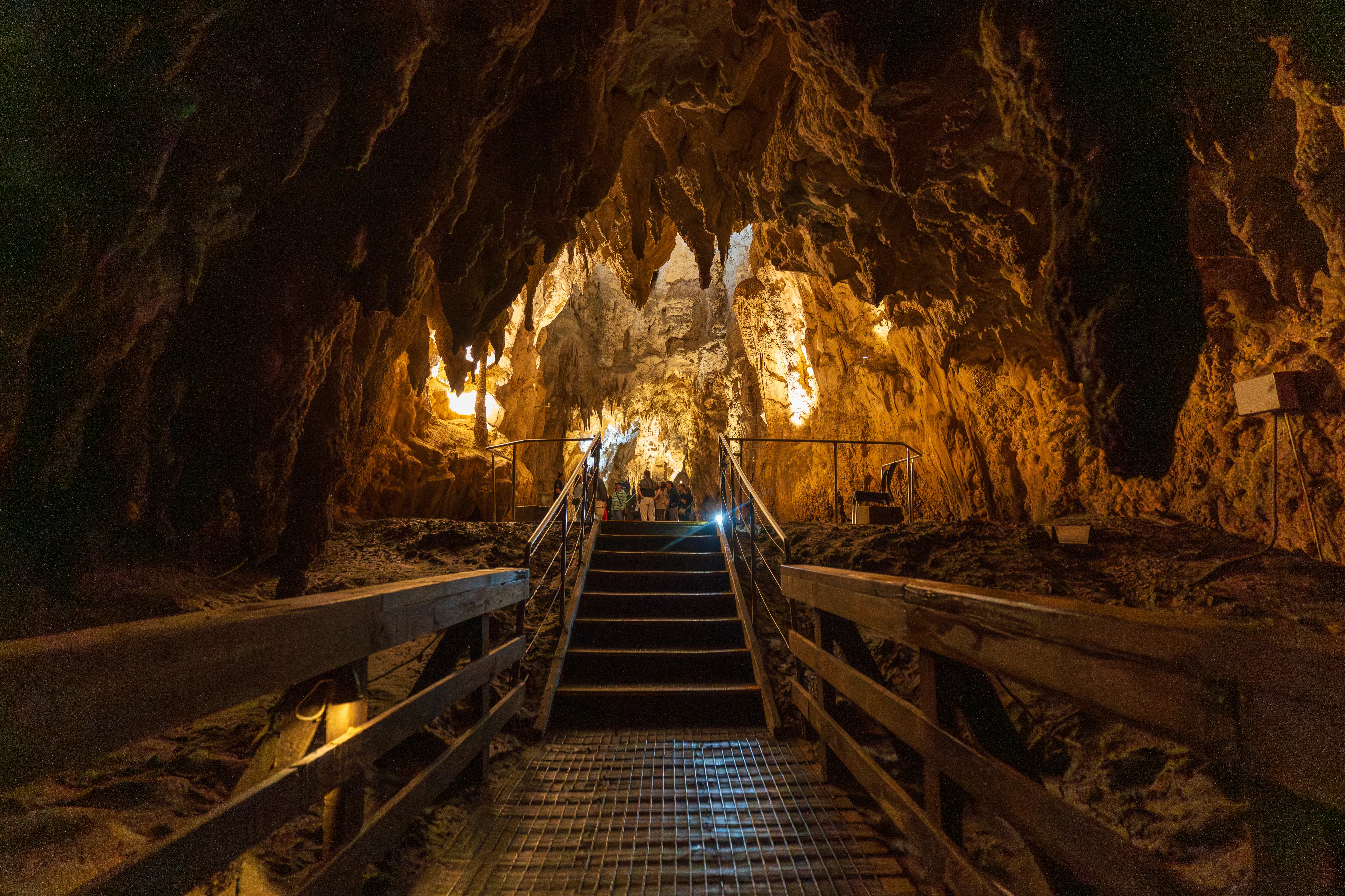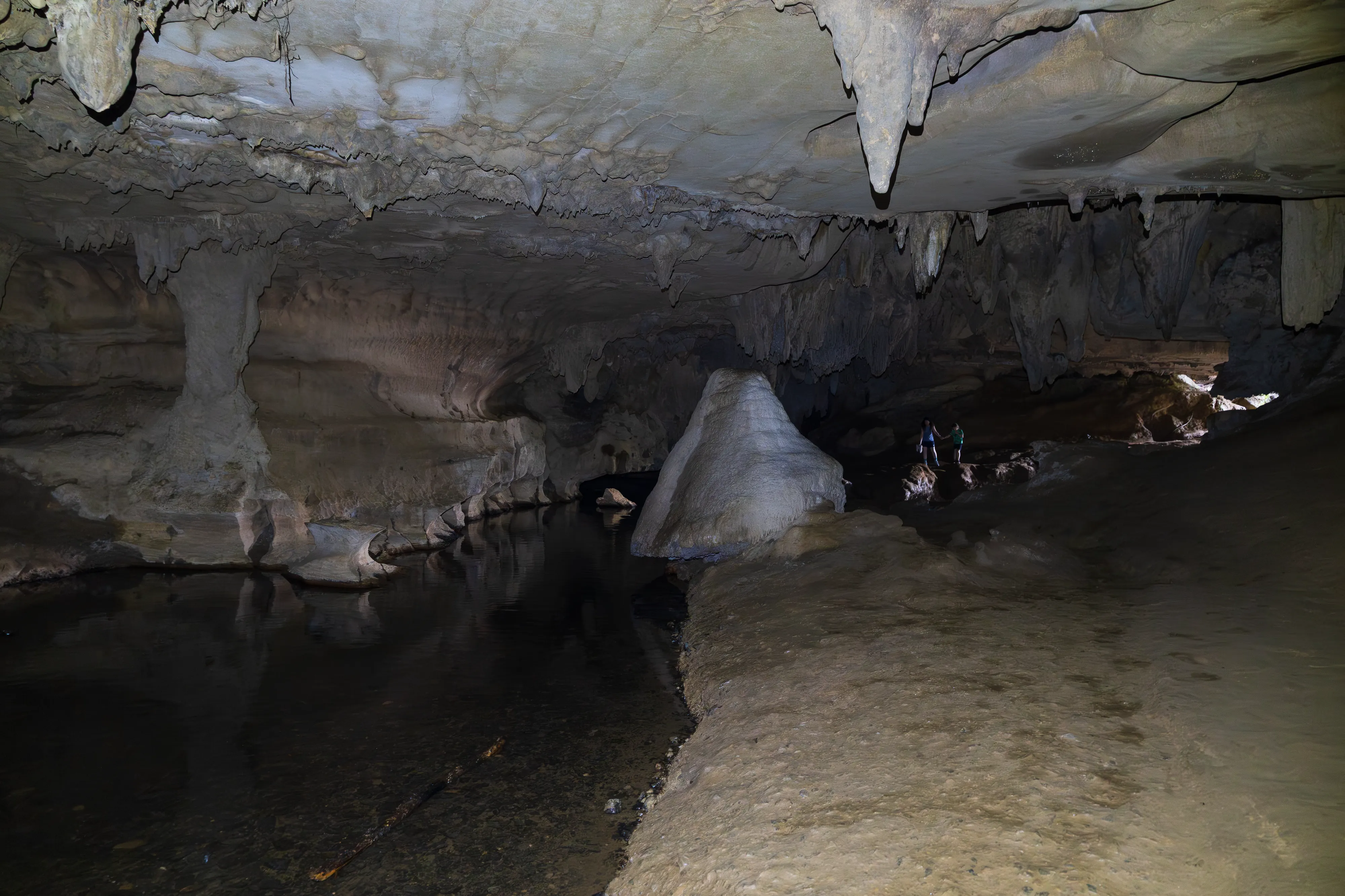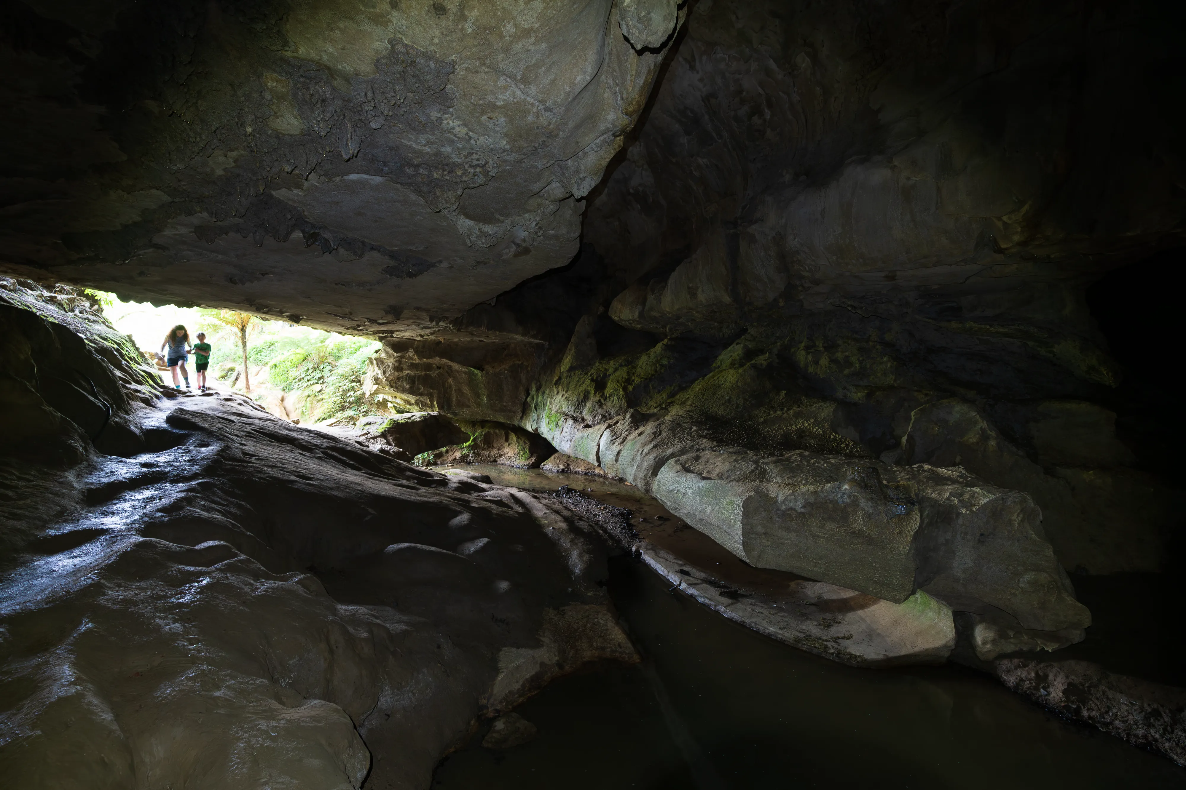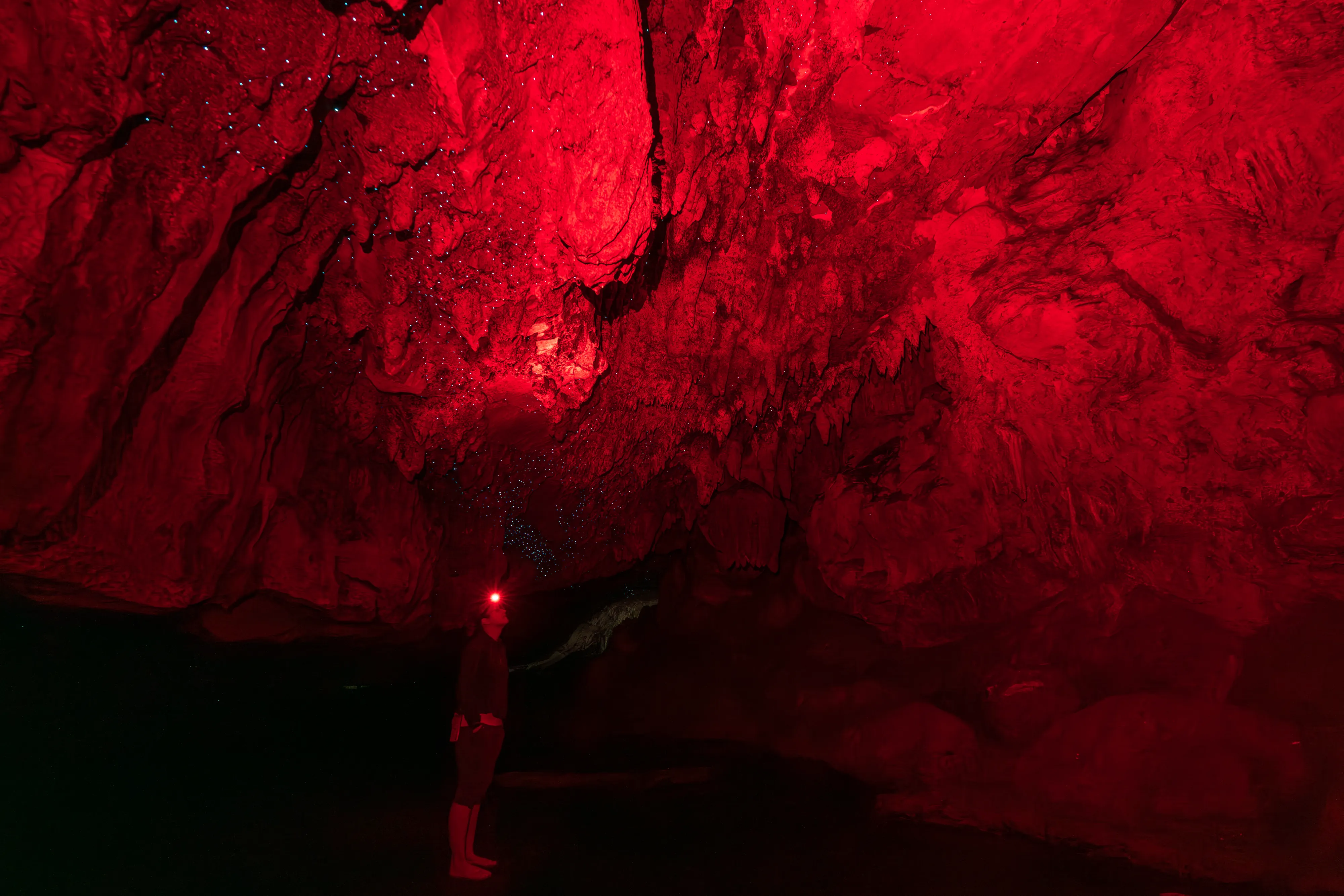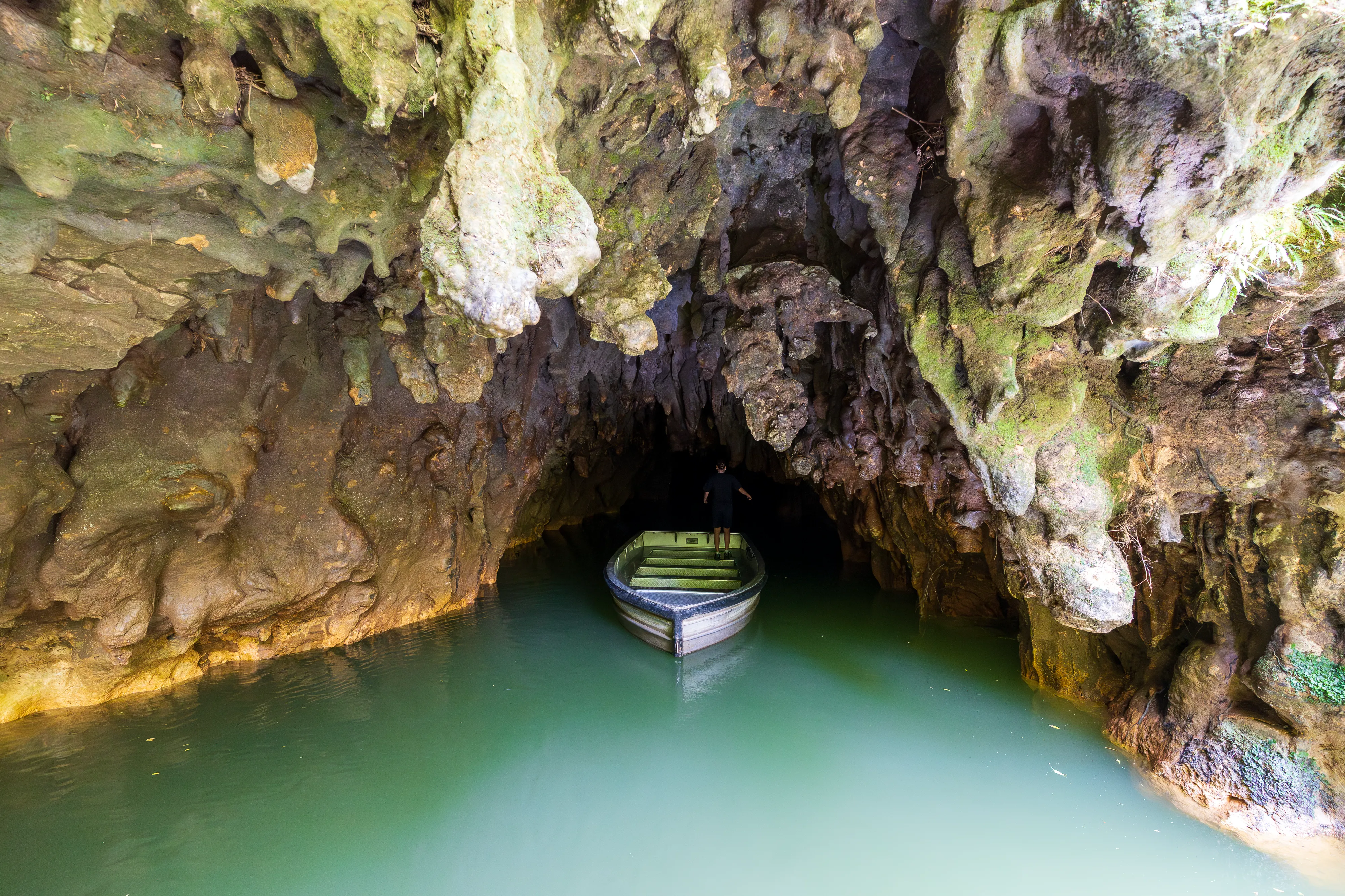 Die Führung beginnt in den Kalksteinhöhlen, bevor es zum eigentlichen Highlight der Tour geht: der Fahrt mit einem Boot über einen unterirdischen Fluss. Die Besonderheit: Über dem Fluss sehen wir unzählige Glühwürmchen an der Decke. Diese Glühwürmchen benötigen Feuchtigkeit zum Leben und kleben sich daher an die Höhlendecke, von wo aus sie Fäden mit Neurotoxinen hinabbaumeln lassen, um Insekten für den späteren Verzehr zu fangen - welche sie durch ihr Leuchten anzulocken versuchen. Unsere Führerin erzählt uns, dass die Glühwürmchen nur im Zwischenstadium für ein paar Monate aufgrund von Biolumineszenz glühen, danach fangen sie an sich zu verpuppen. Als Erwachsene leben sie dann nur noch mehrere Tage, da sie während ihres Wandels ihr Verdauungssystem einbüßen. Viel Zeit für die Fortpflanzung bleibt ihnen also nicht.