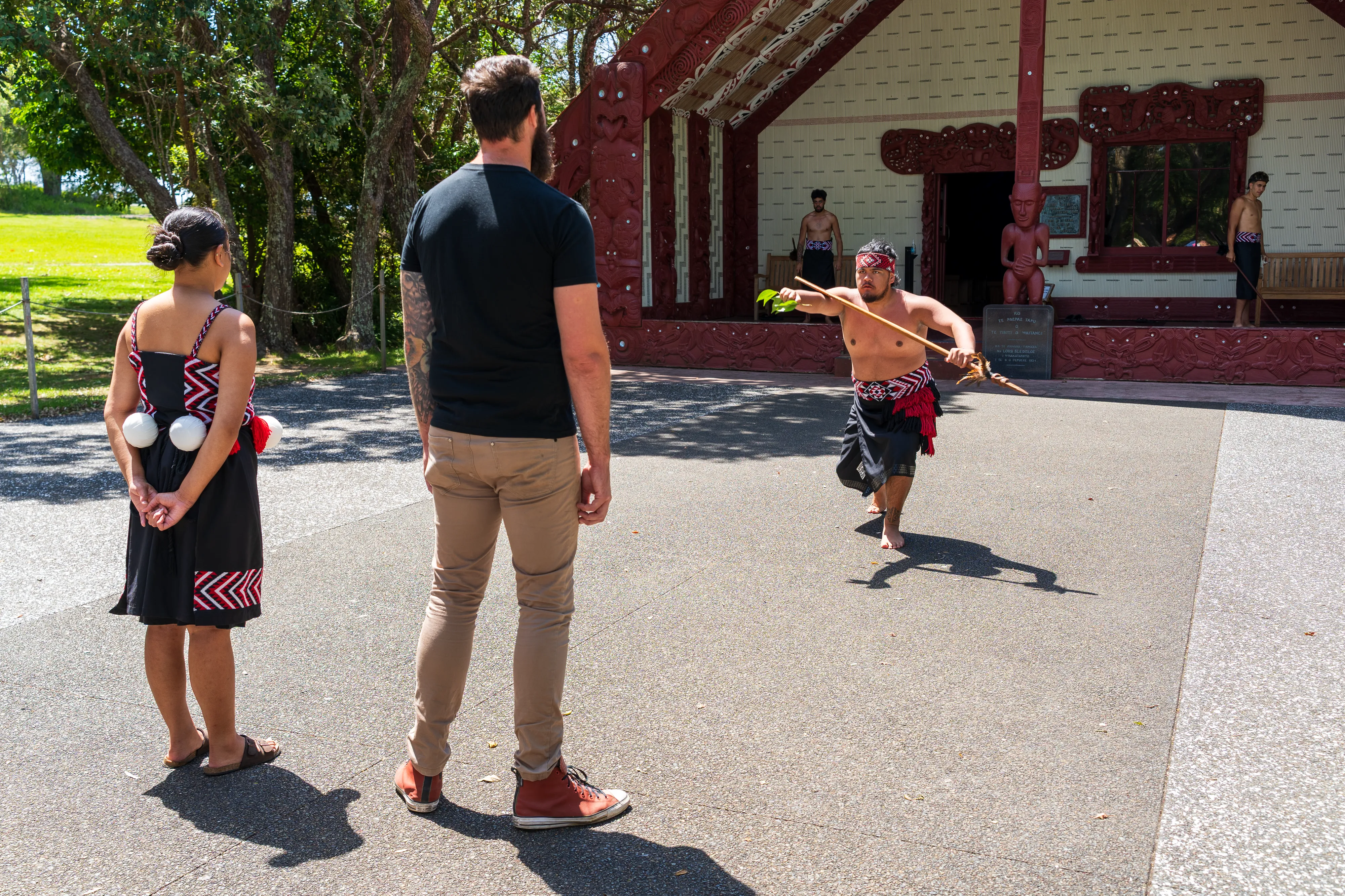 Neben einer Führung über das Gelände mit historischen Gebäuden bekommen wir auch eine maorische Tanz- und Gesangsaufführung im Te Whare Rūnanga (Versammlungshaus der Maori) geboten. Nun sehen wir also auch einmal einen Haka, einen rituellen Tanz - nicht notwendigerweise ein Kriegstanz - der Maori.