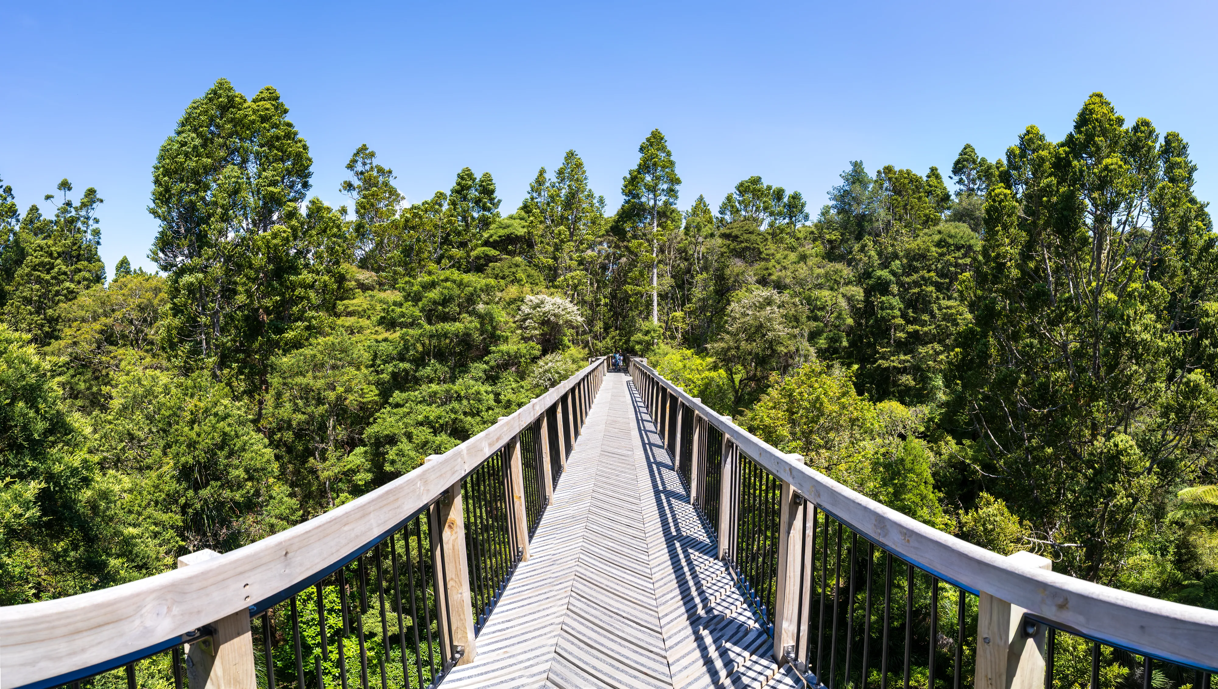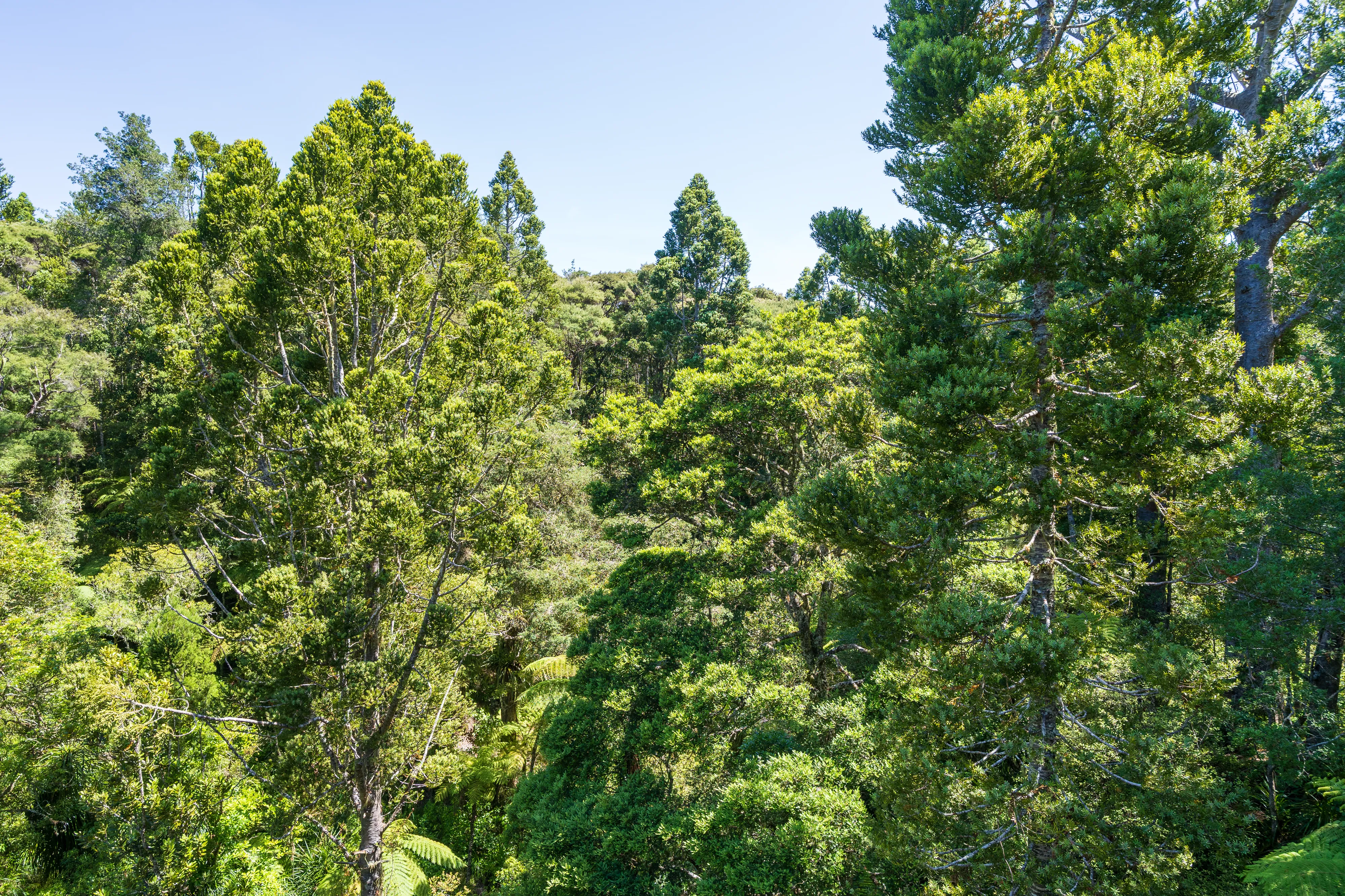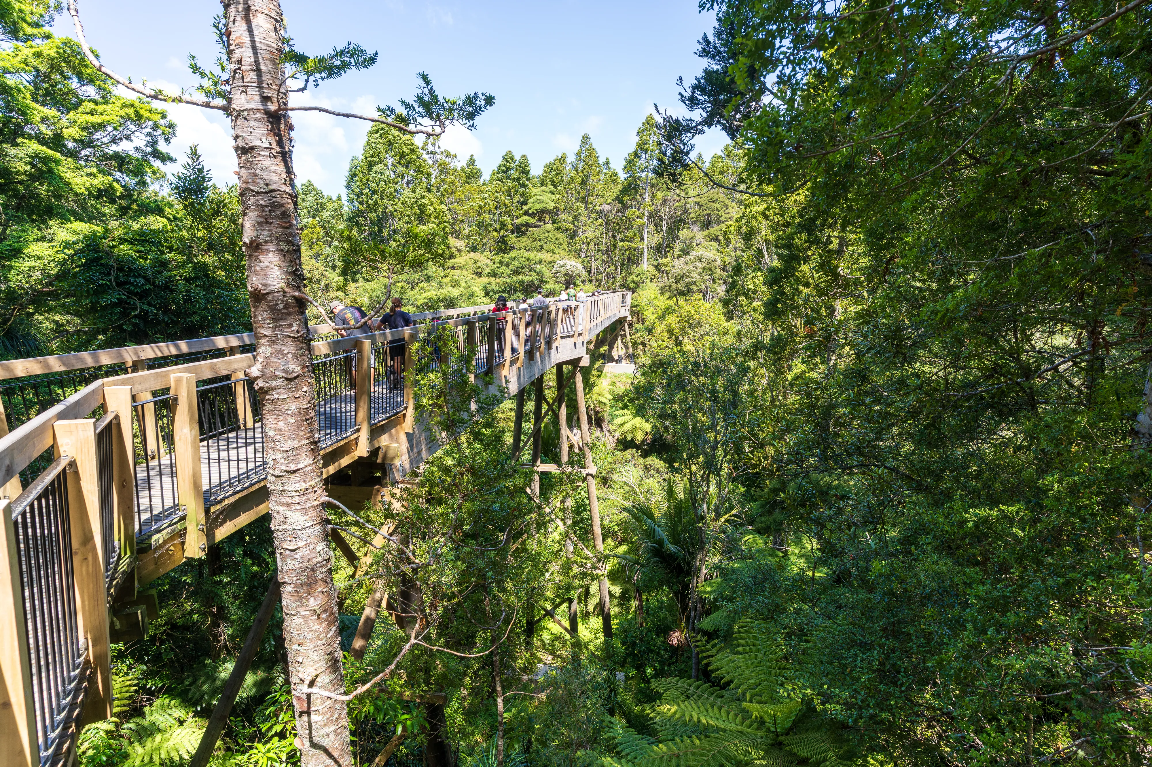 In den Außenbezirken von Auckland stoppen wir noch beim Kauri Glen Reserve. Hier können wir endlich die berühmten Kauribäume aus der Nähe - und dank des Tree-Top-Walks sogar auf “Augenhöhe” - sehen. Ganz schön beeindruckende Gesellen - nur schade für sie, dass ihr Holz so viele vorteilhafte Eigenschaften aufweist und sich daher über die Jahrzehnte bei Holzfällern großer Beliebtheit erfreut hat.